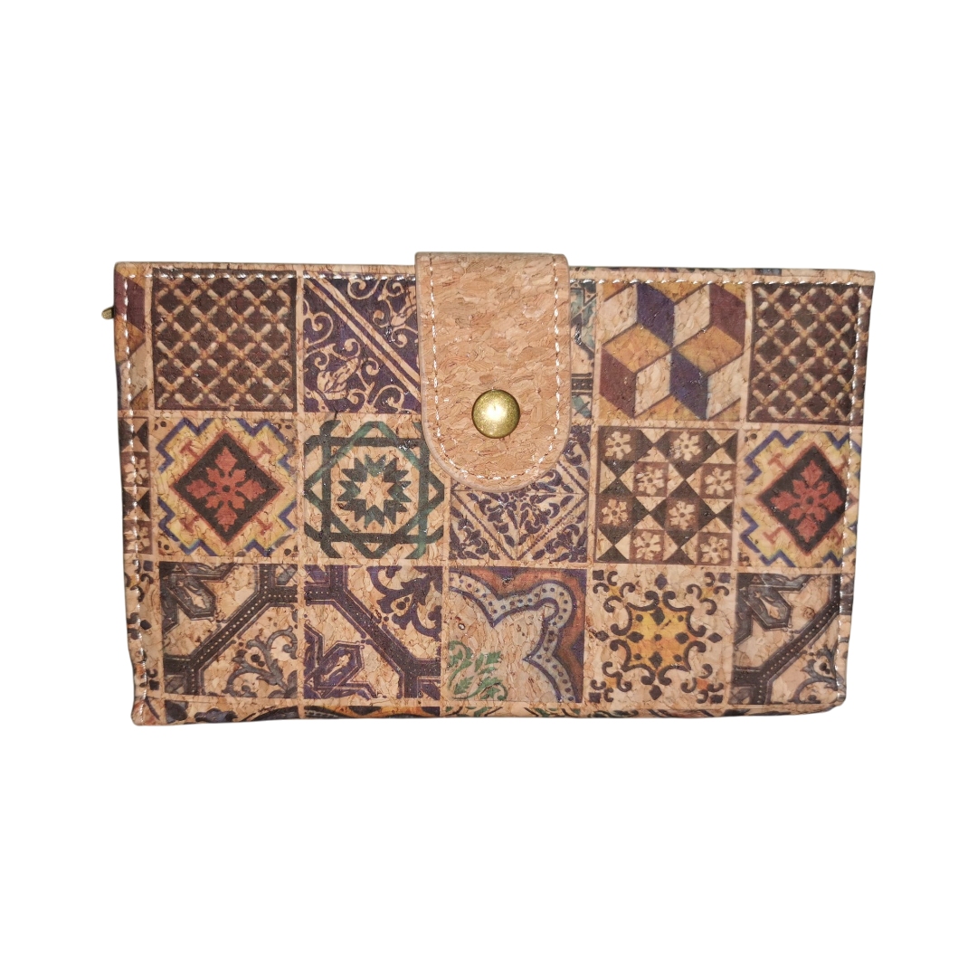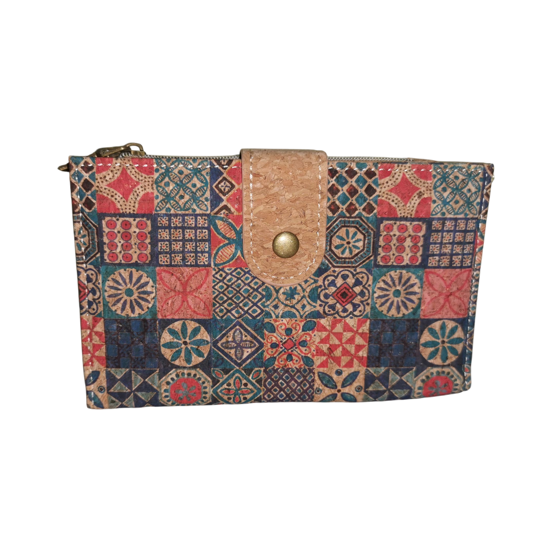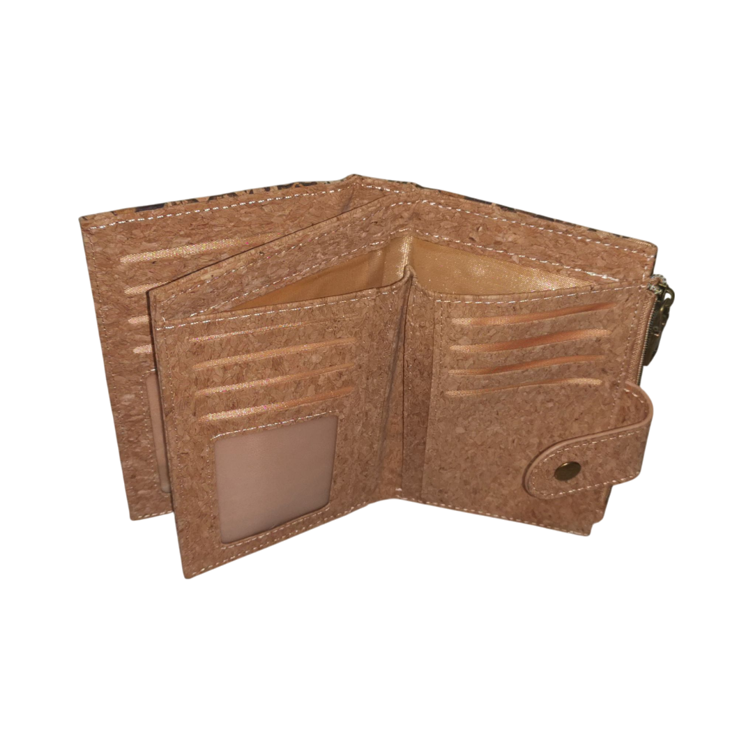 Billetera compacta eco de corcho en tamaño mediano, con broche de seguridad y monedero zipper. Espaciosa, práctica y sostenible para el día a día.