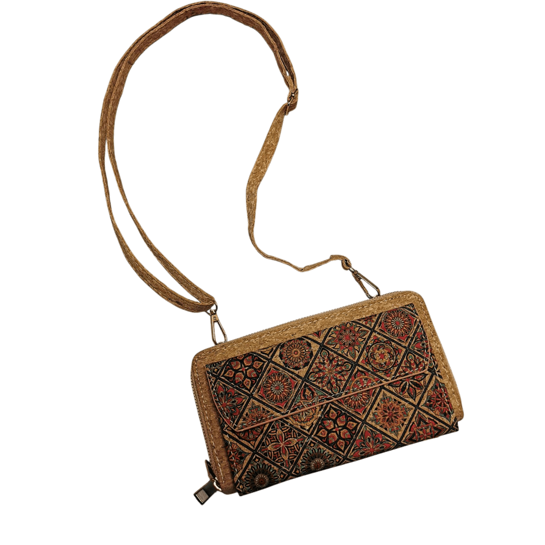 Billetera manos libres de corcho con porta celular y tarjetero. Práctica, elegante y sostenible, con tira removible para usar como cartera o bolso.