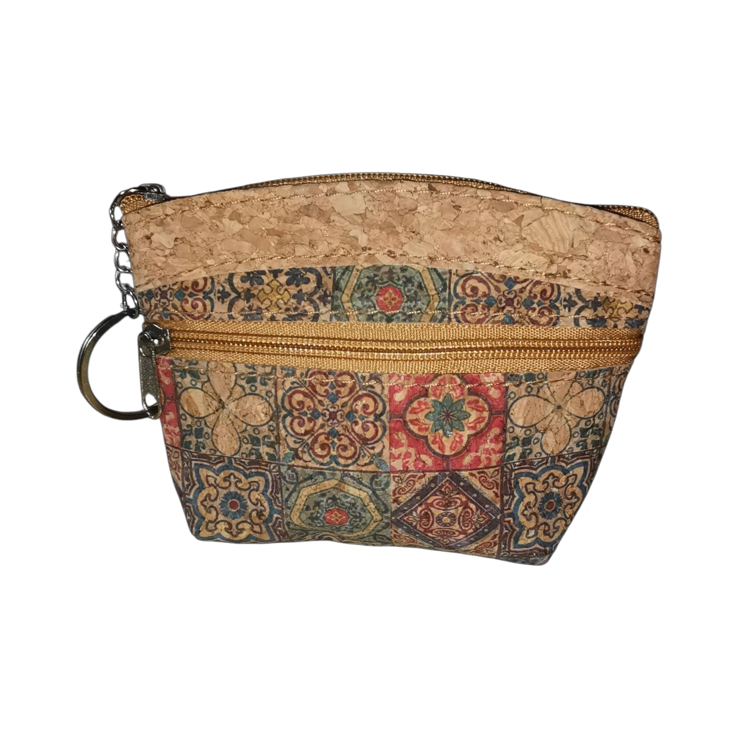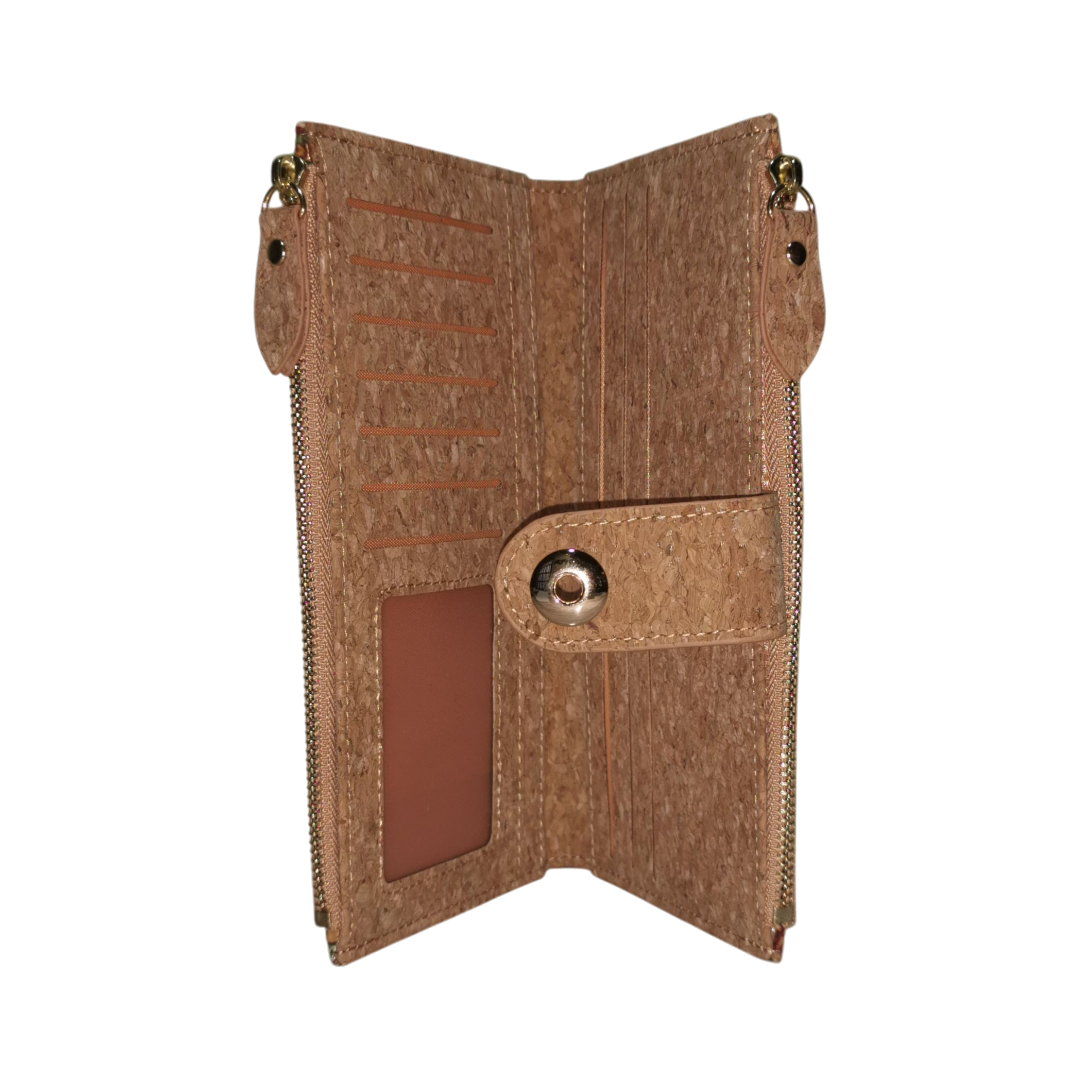 Billetera slim de corcho con doble cierre zipper. Compacta, ligera y con gran capacidad para organizar tarjetas, billetes y monedas.