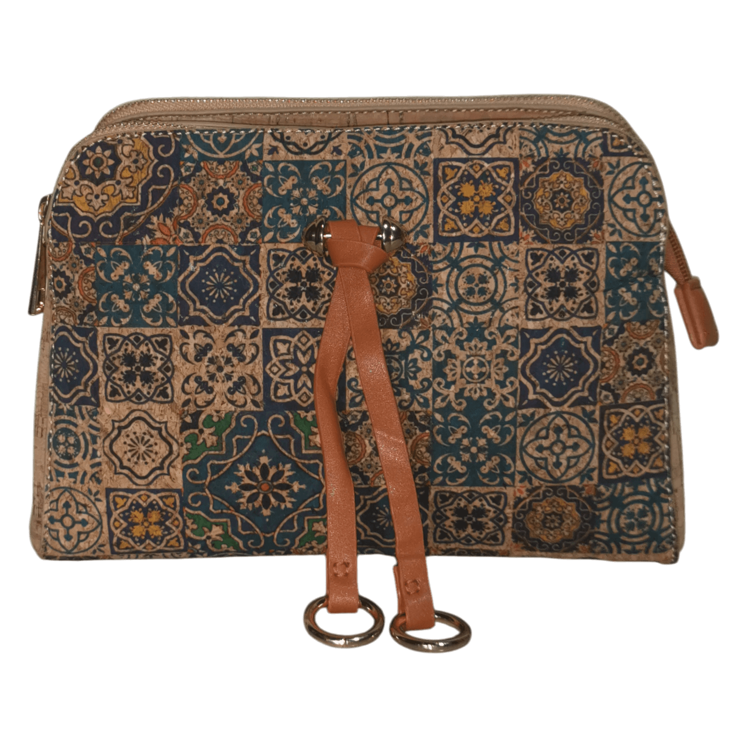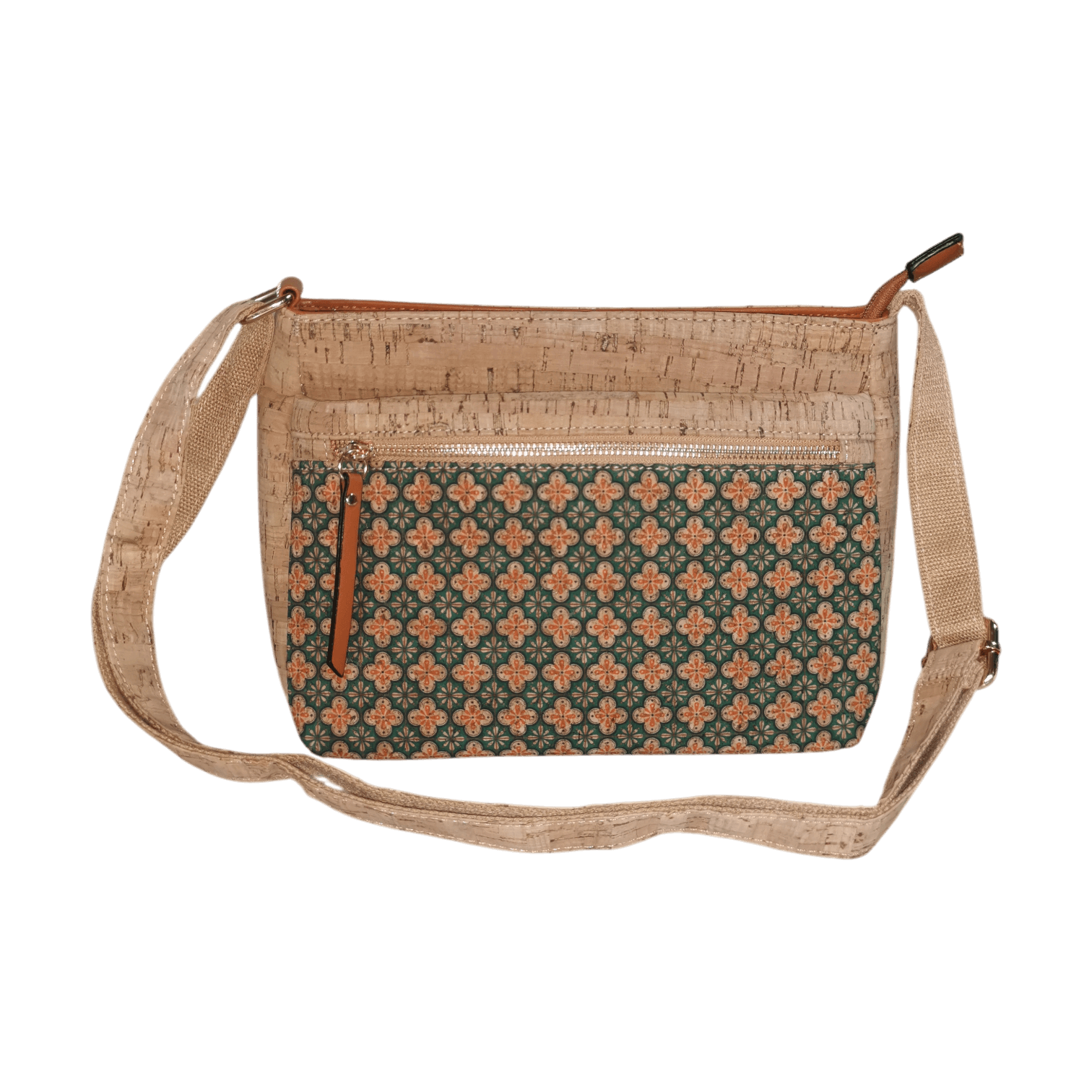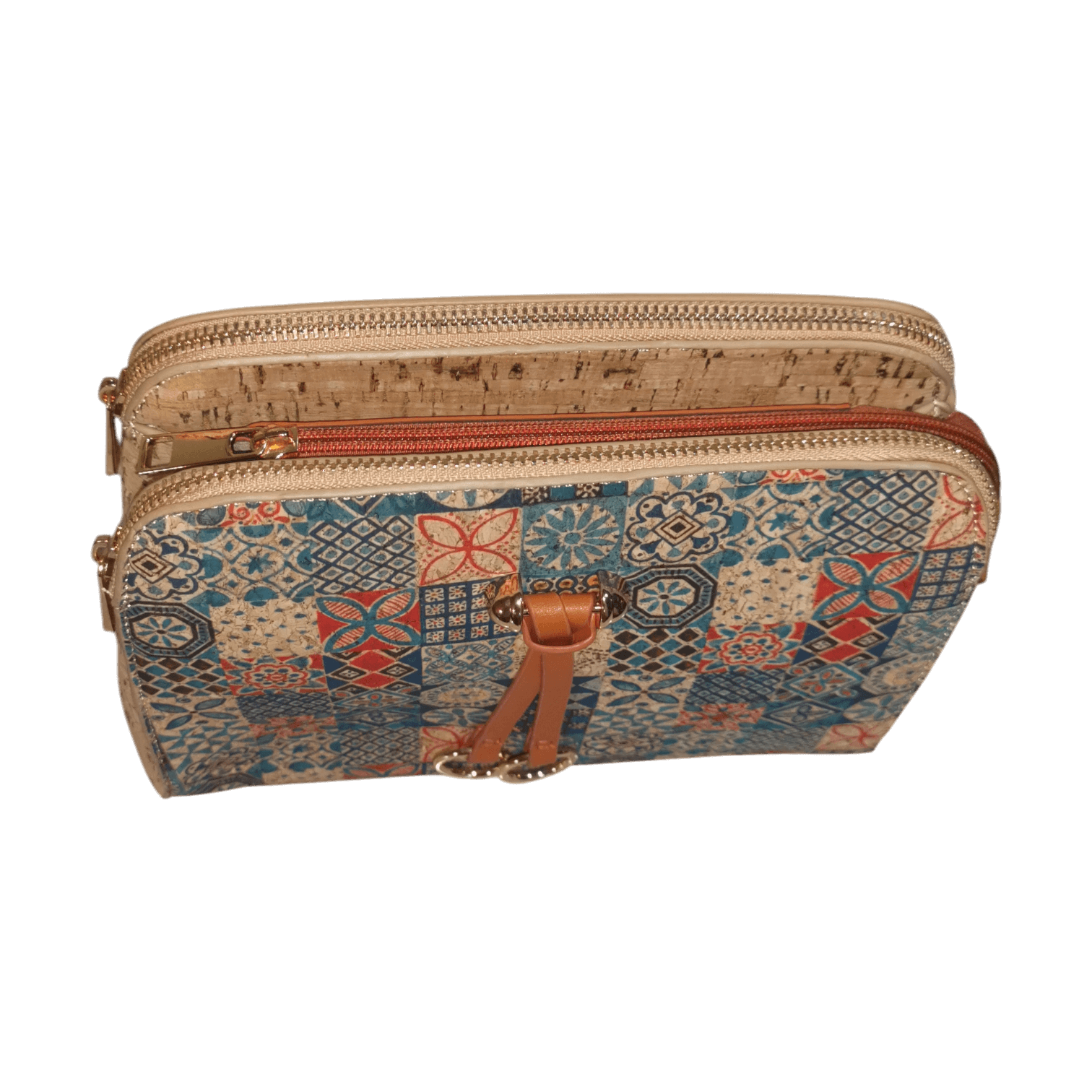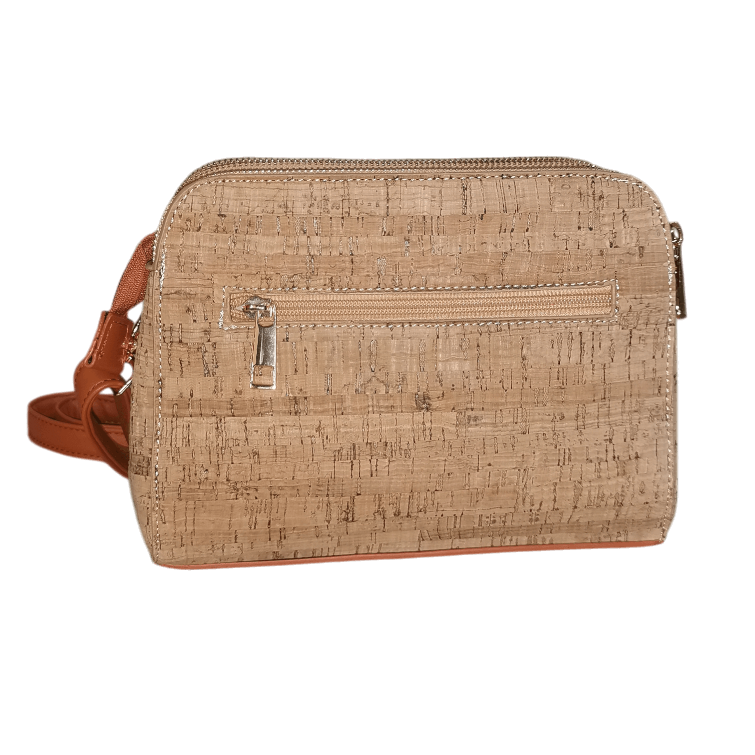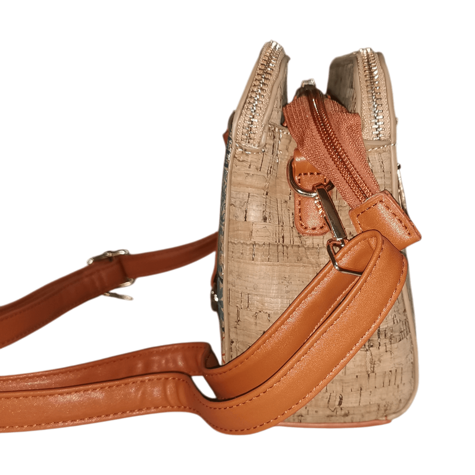 Bolso compacto de corcho natural y sostenible. Posee tres cierres de zipper distribuidos en dos compartimentos superiores y uno trasero. Es un accesorio ligero, resistente y totalmente vegano. Incluye correa ajustable para mayor versatilidad y comodidad en el uso diario.