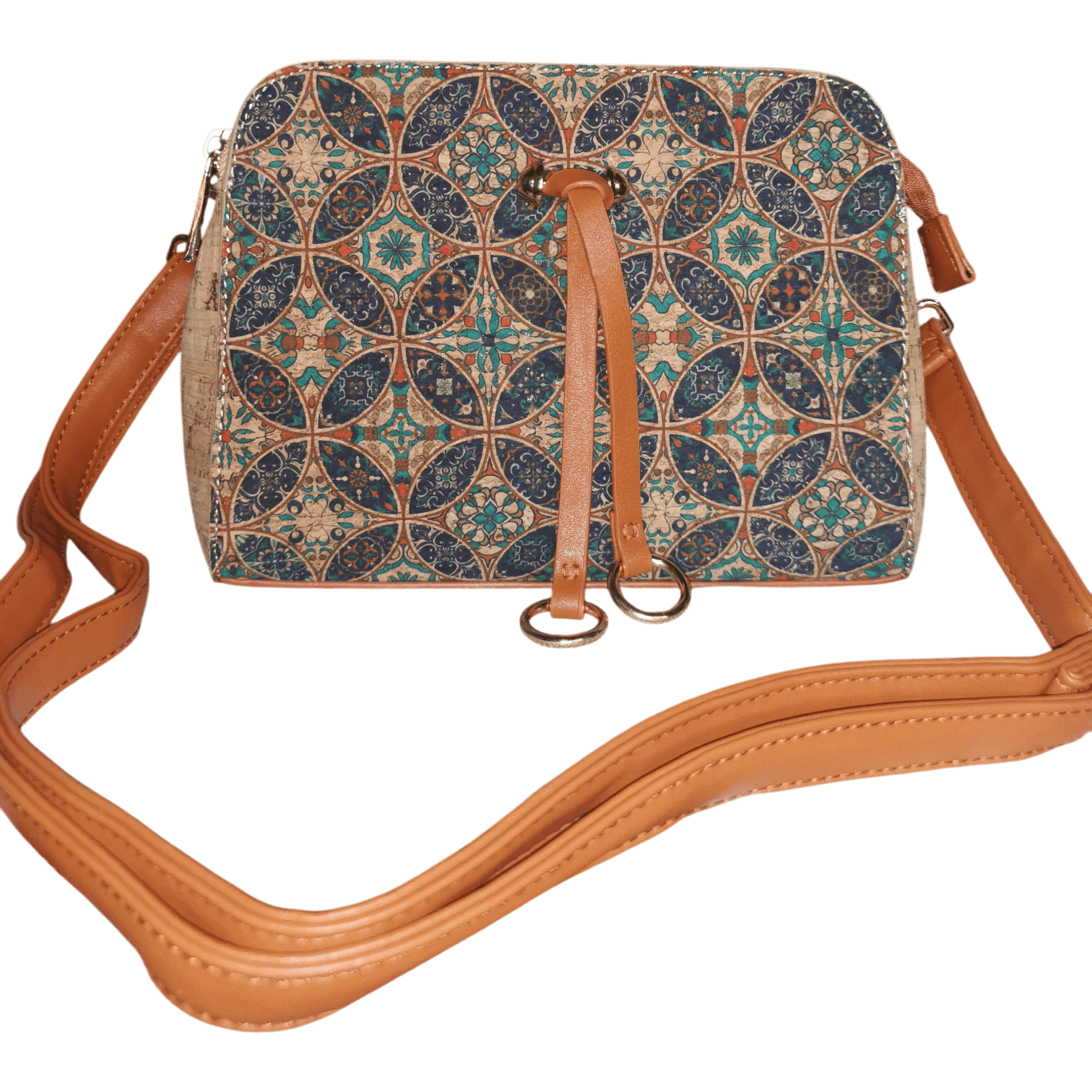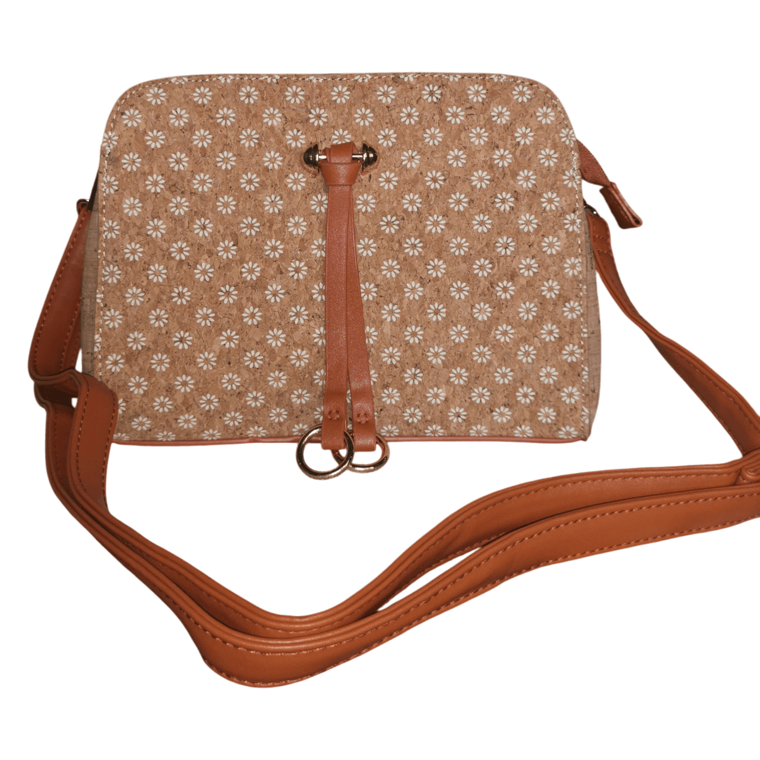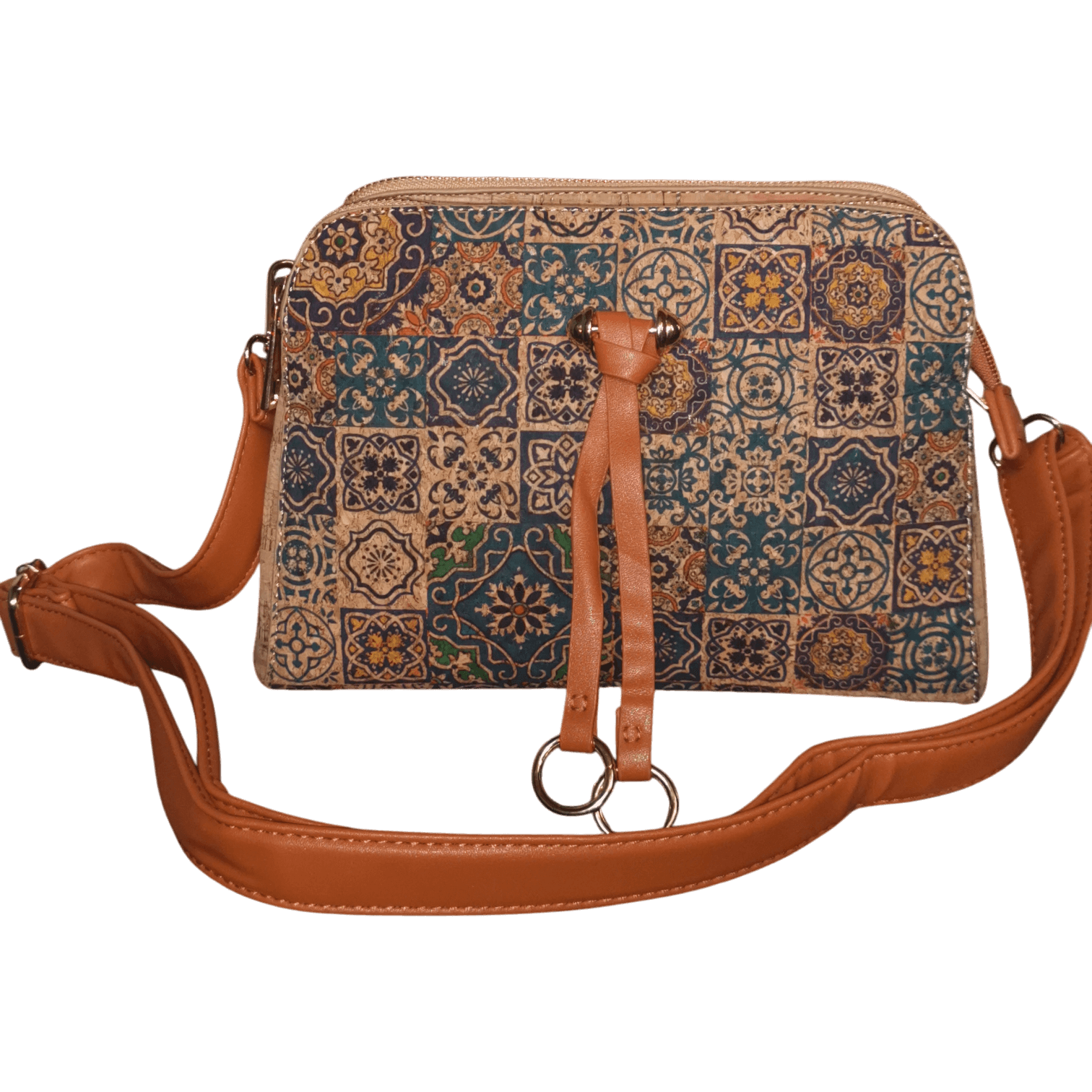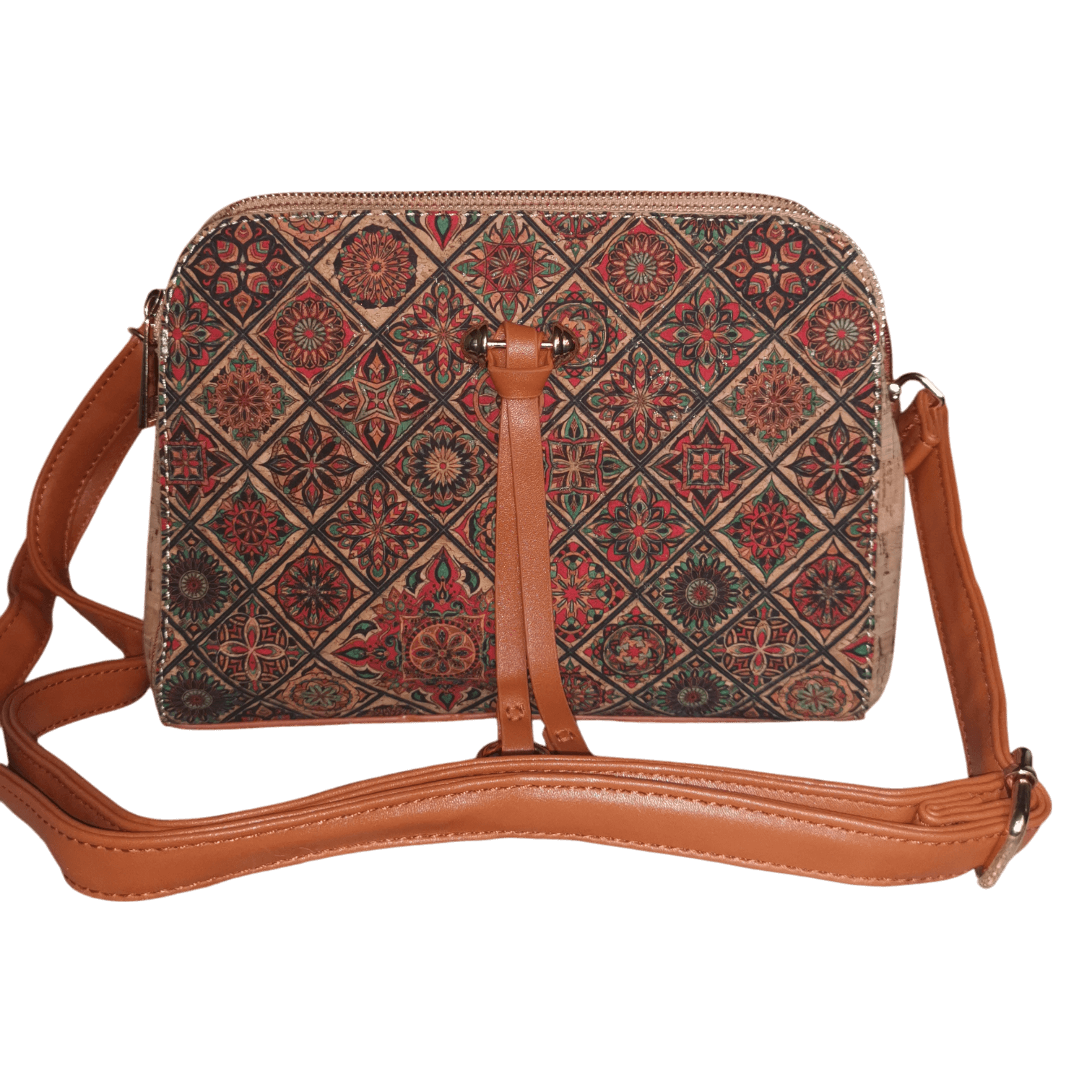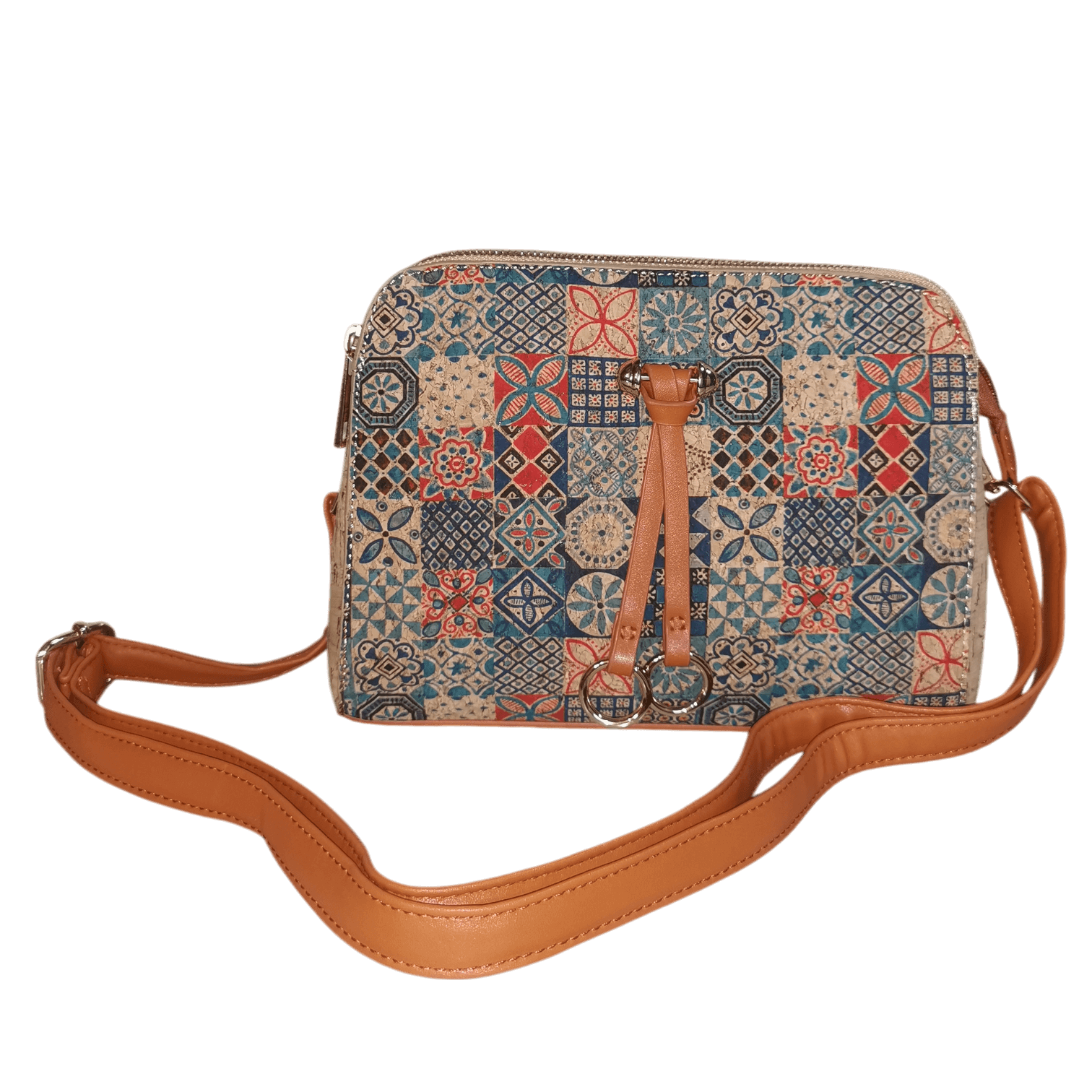 Bolso compacto de corcho natural y sostenible. Posee tres cierres de zipper distribuidos en dos compartimentos superiores y uno trasero. Es un accesorio ligero, resistente y totalmente vegano. Incluye correa ajustable para mayor versatilidad y comodidad en el uso diario.
