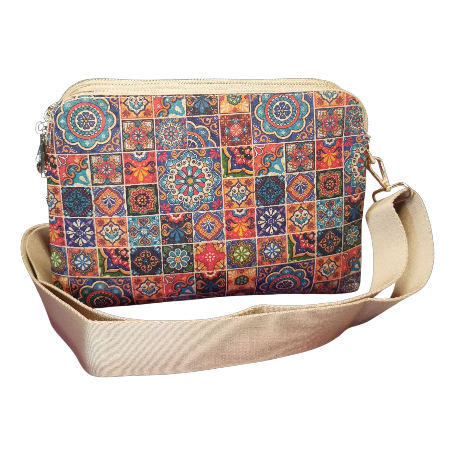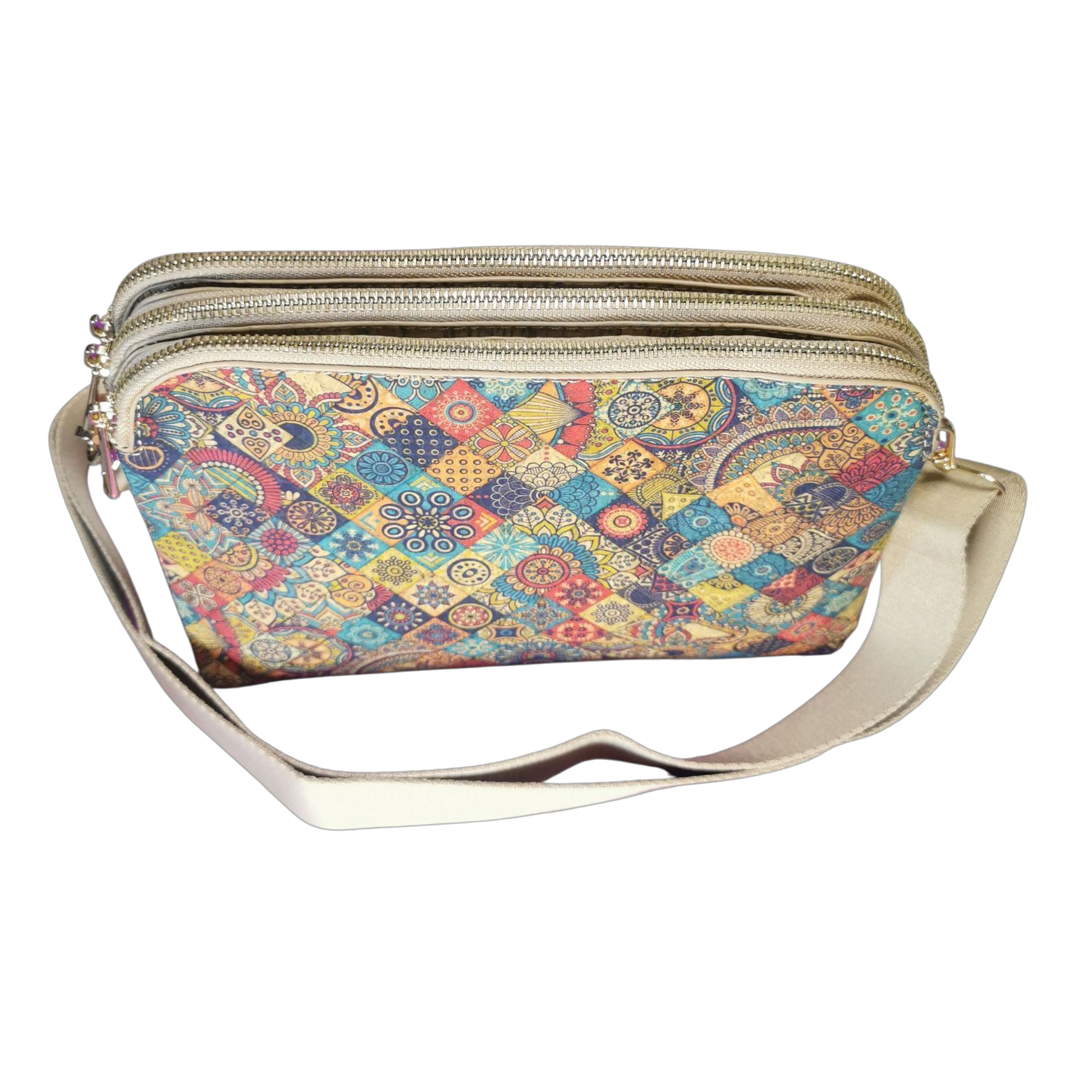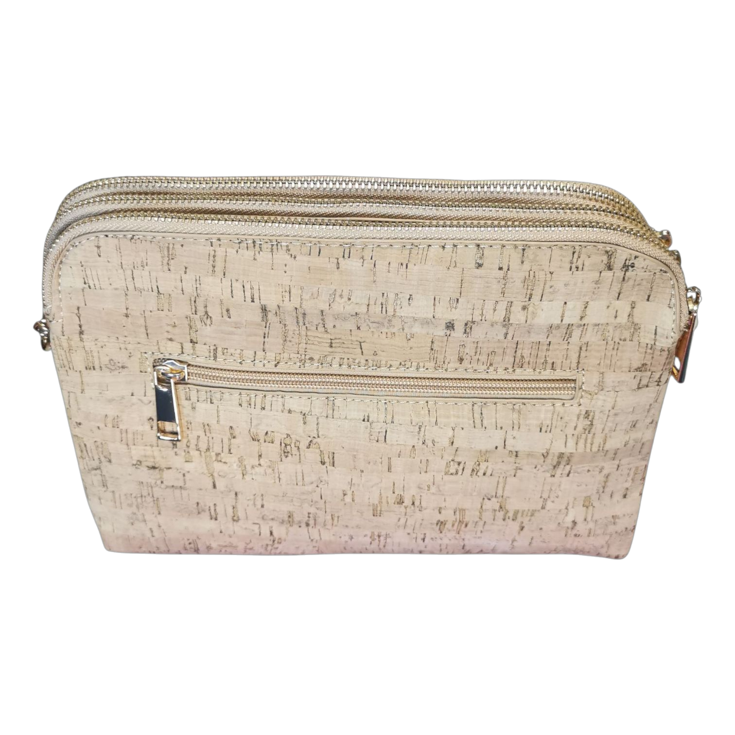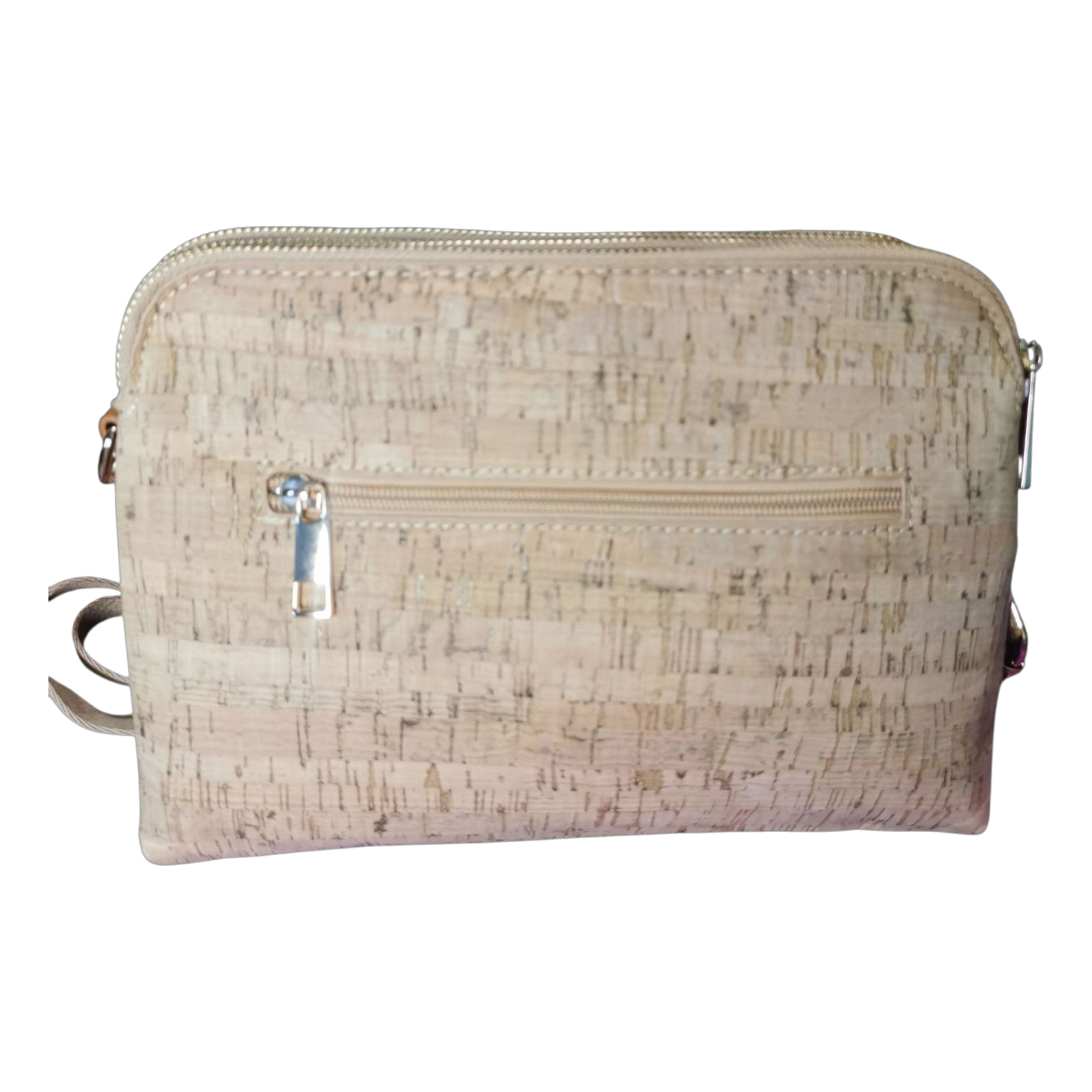 Bolso de corcho con tres compartimentos independientes, cada uno con cierre de zipper. Tirante grueso, removible y ajustable para usar cruzado u al hombro. Ligero, práctico y disponible en variados diseños.