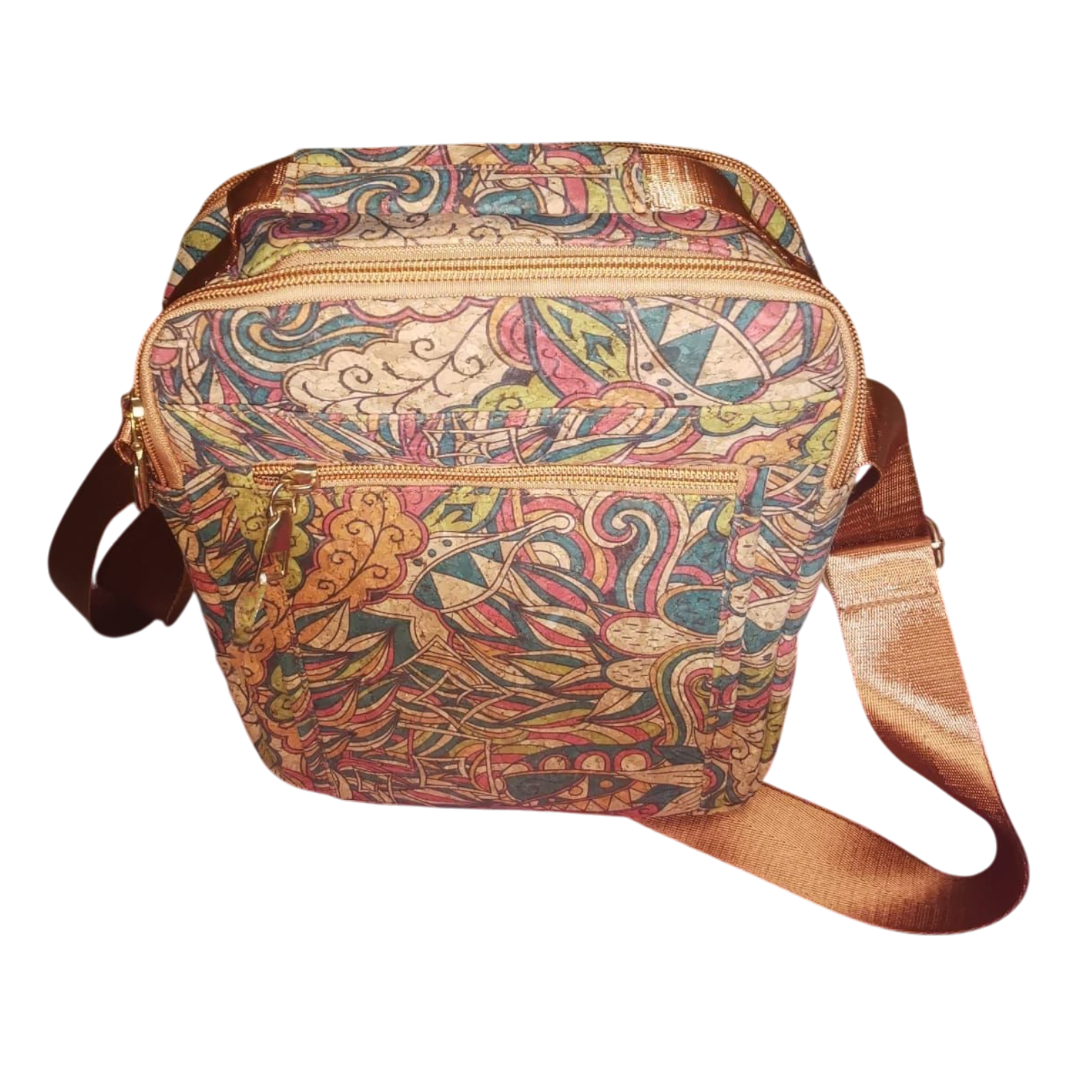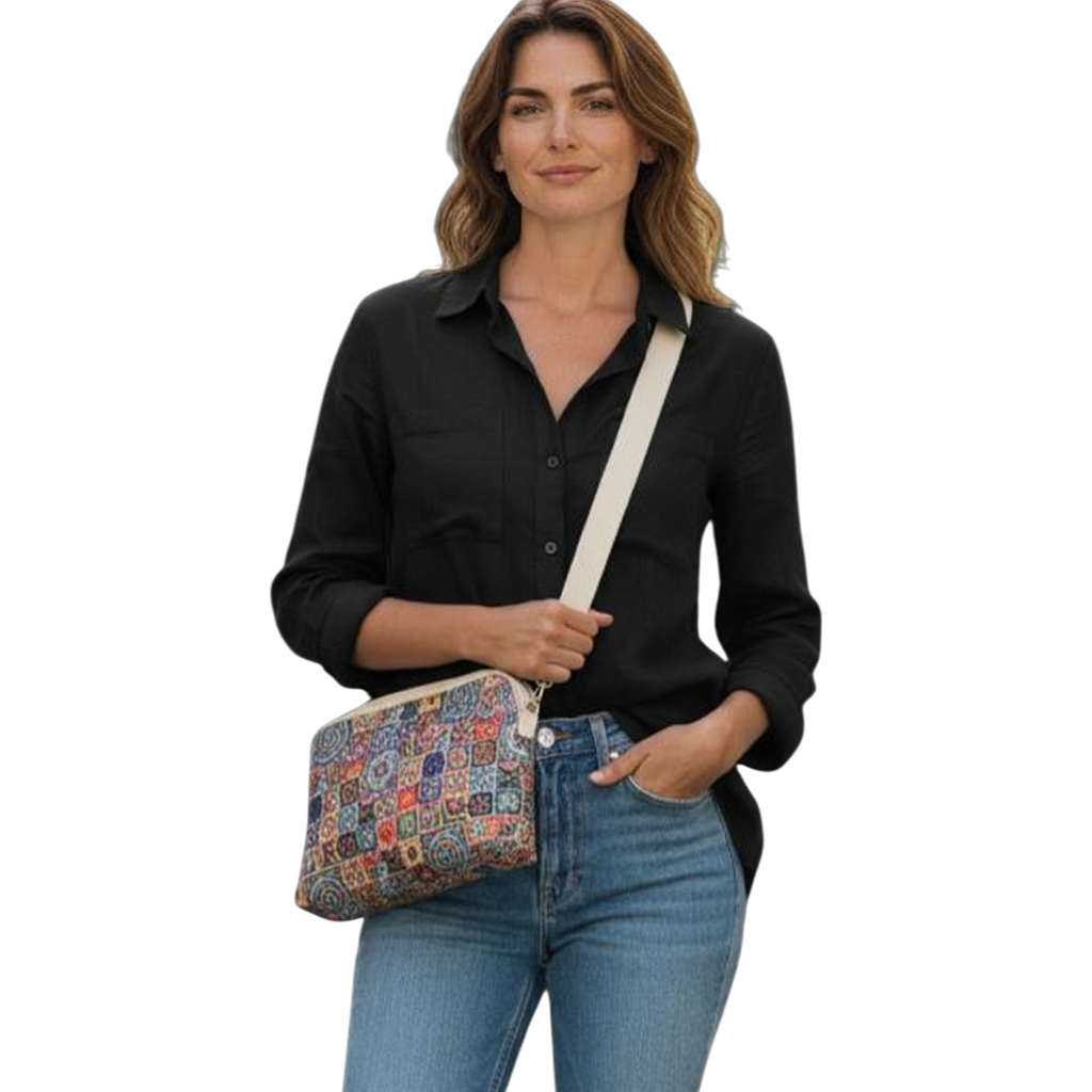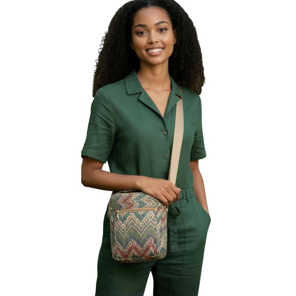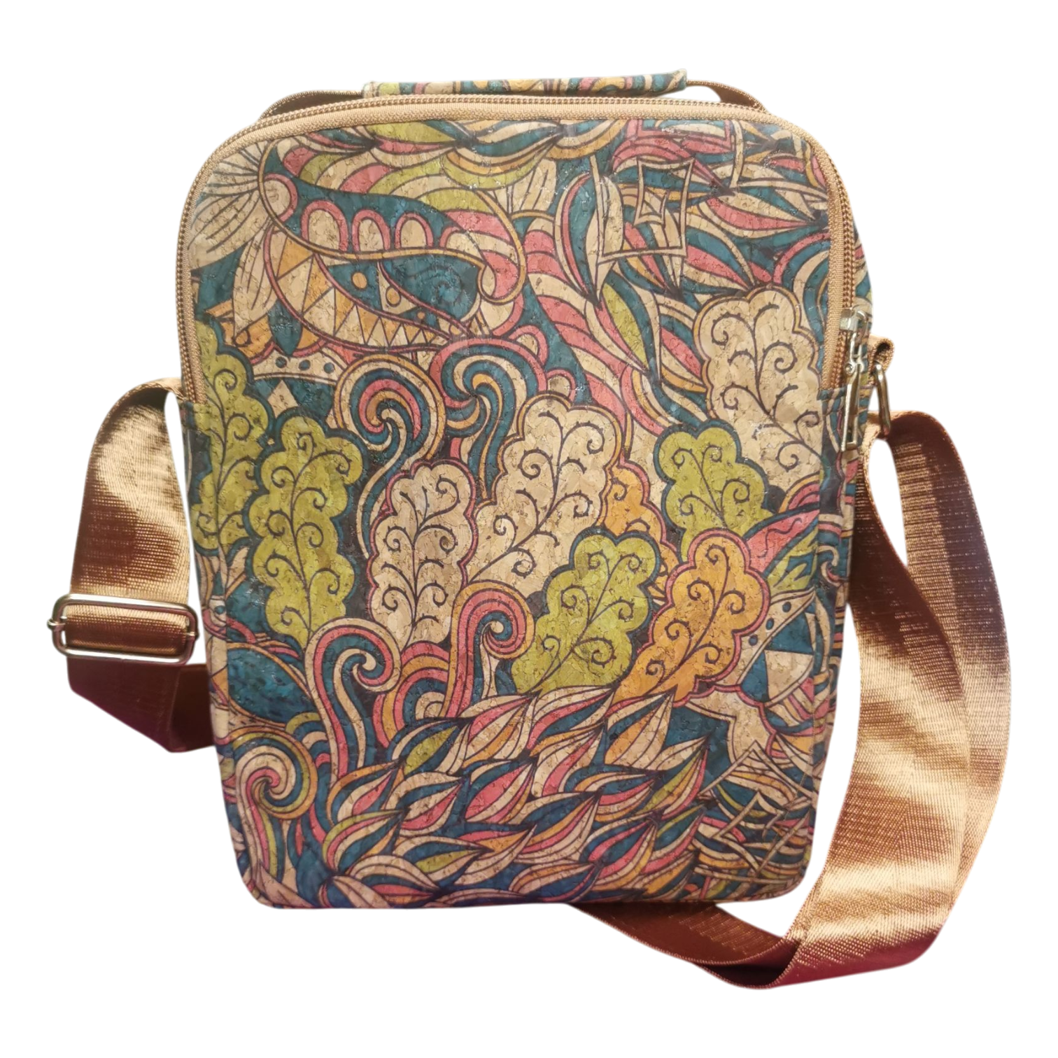 El bolso de corcho bandolero grande es perfecto si buscas comodidad, espacio y un diseño con mucha personalidad. Su formato vertical y su estampado de hojas y ondas en colores vivos lo convierten en un accesorio ideal para el día a día, pero con un toque artístico y juvenil que resalta en cualquier look.