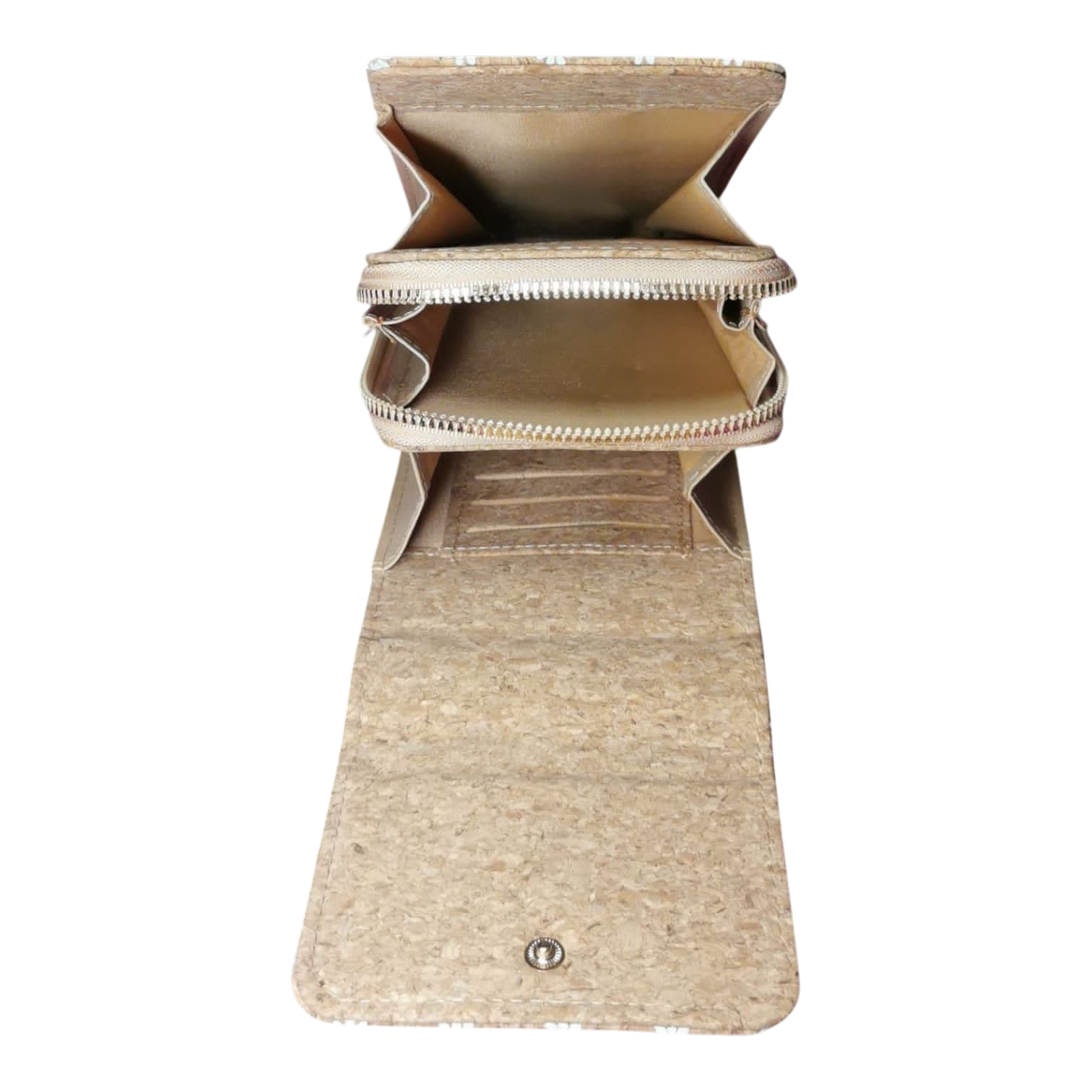 En el interior, el bolso de corcho manos libres ofrece un triple compartimiento muy práctico. Dos secciones abiertas sirven para organizar billetes, papeles o documentos pequeños, mientras que la tercera cuenta con cierre de zipper, ideal para monedas u objetos que quieres mantener más seguros. Además, incorpora ranuras para tarjetas, por lo que puedes usarlo perfectamente como mini billetera.