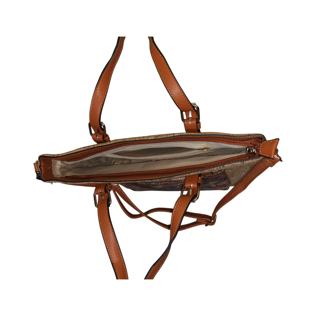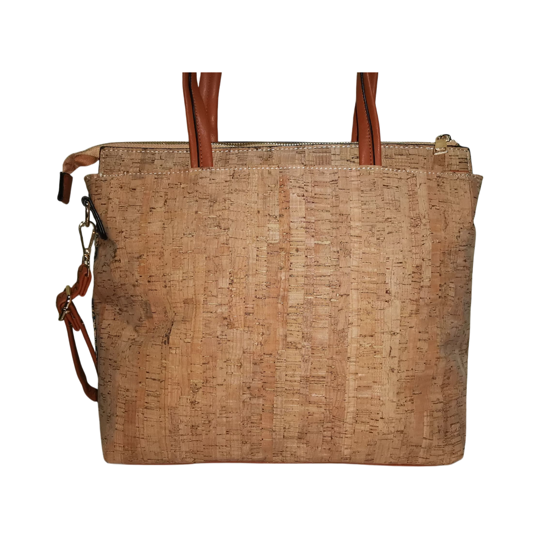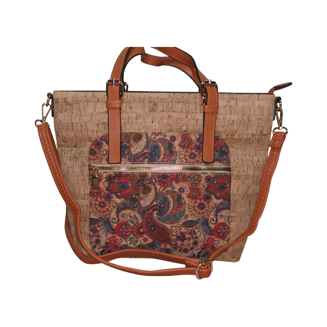 Bolso mediano de corcho con bolsillo externo estampado y cierre zipper. Versátil, eco-friendly y con asas desmontables para usar de mano o al hombro.
