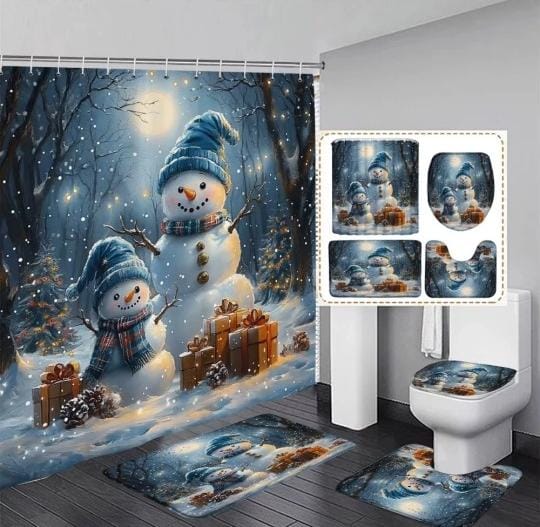 Set navideño para baño con muñeco de nieve: cortina 180×180 cm, tapetes antideslizantes y funda para tapa de inodoro. Material 100% poliéster impermeable y lavable, con diseños invernales y navideños llenos de ternura.
