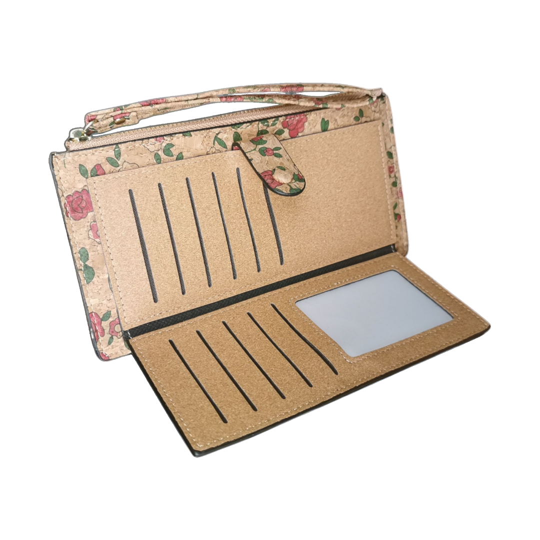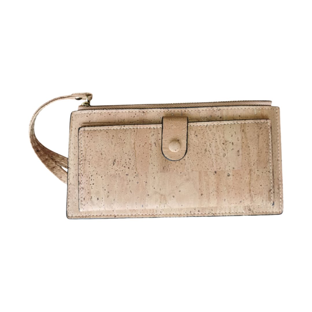 Billetera larga de corcho natural con múltiples ranuras para tarjetas, espacio para billetes y broche de seguridad. Funcional, ligera y sostenible.